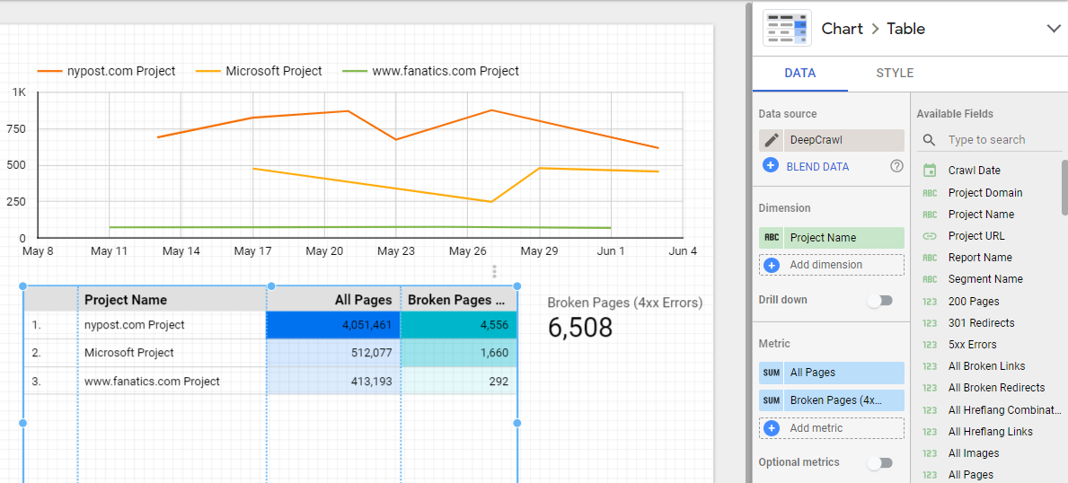 Our connector is designed to allow you to choose whether you want to pull in either data from the latest crawl or from a date range on a chart-by-chart basis. For instance, you could have a time-series graph showing the evolution of your Broken Pages over time, and a score card showing the number of broken pages that currently exist. For this to work, the “Allow ‘Crawl Selection’ to be modified in reports” option of the connector configuration must be switched on. With this mode on, each chart will have a new configuration to allow you to switch the data type.